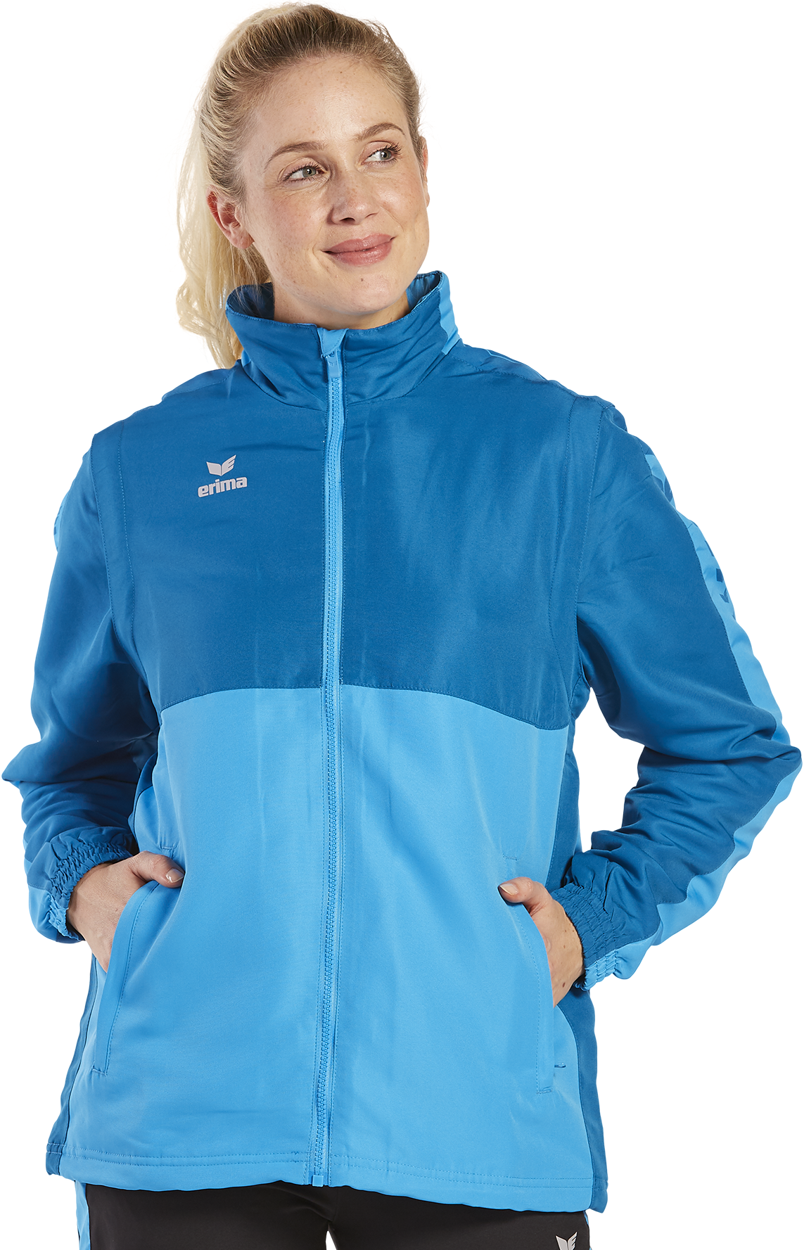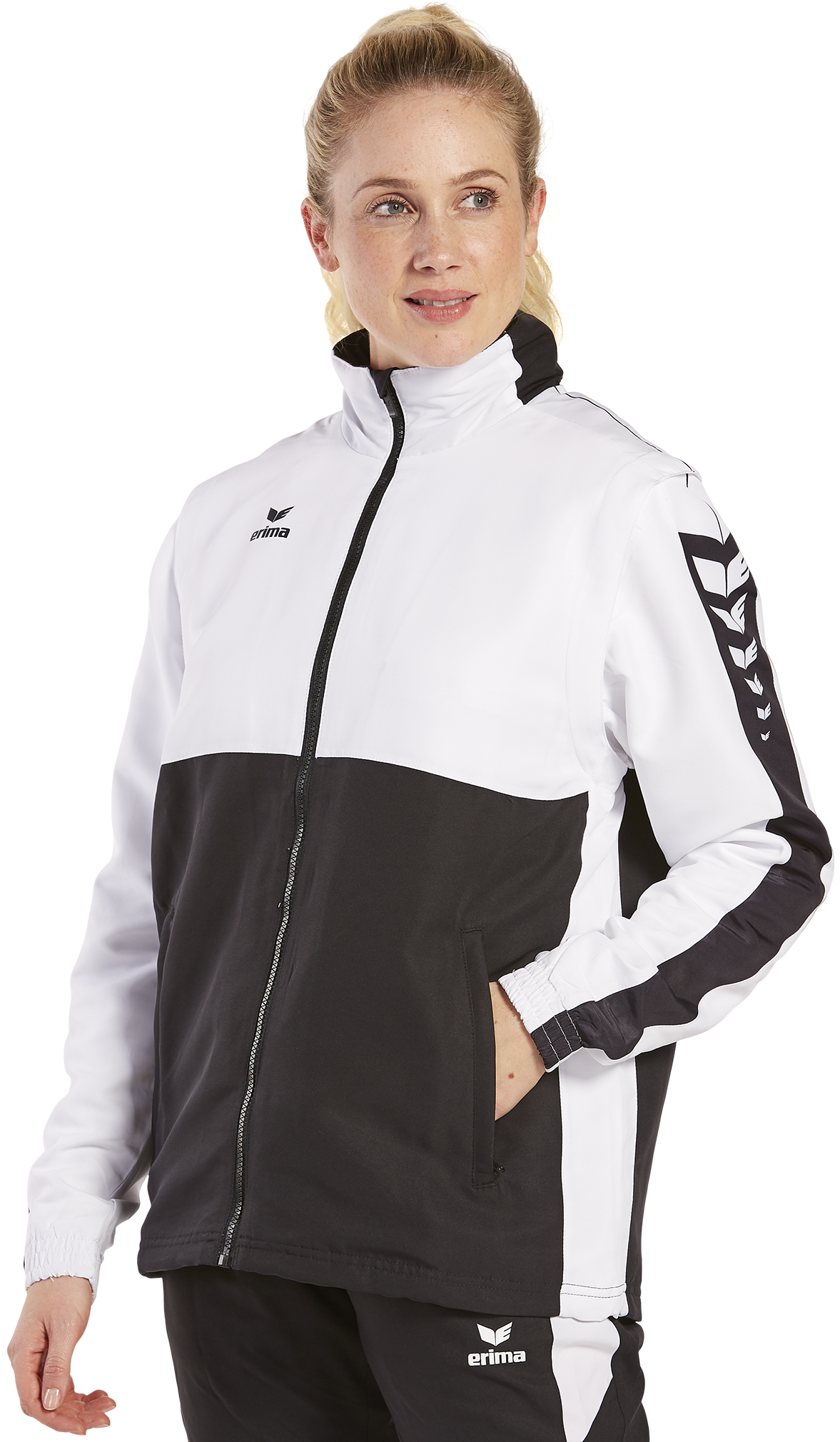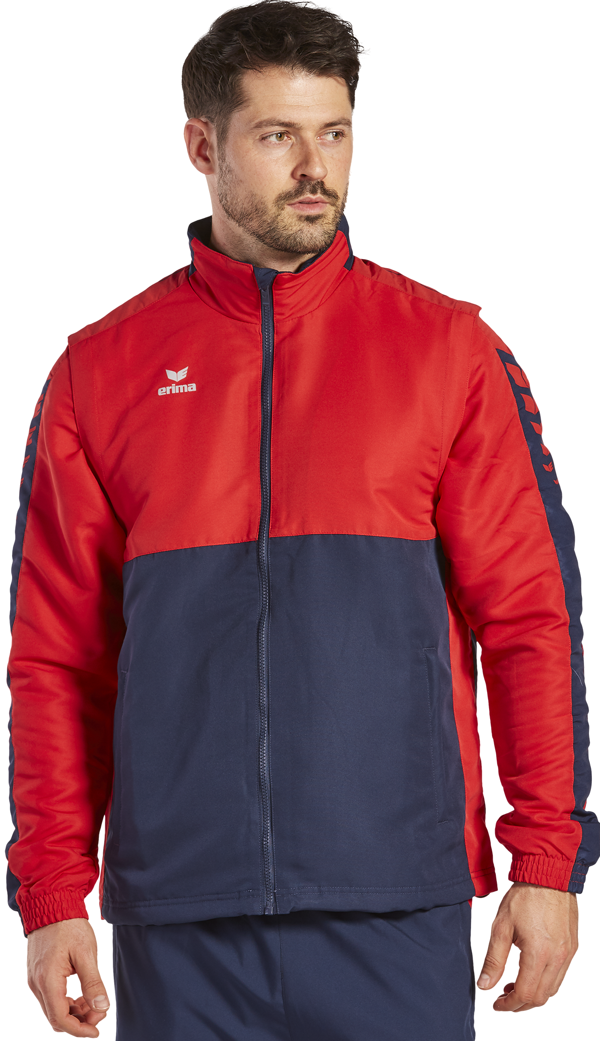 Mit der Six Wings Jacke mit abnehmbaren Ärmeln bist du bei wechselhaftem Wetter bestens ausgerüstet. Die wind- und wasserabweisende Jacke lässt sich nämlich auch als Weste tragen. Die Ärmel kannst du ganz einfach mit einem Reißverschluss abmachen. Bei schlechtem Wetter schützen dich das Innenfutter aus Fleece und die im Kragen integrierte Kapuze optimal vor Kälte und Niederschlag. Damit keine Kälte eindringen kann, verfügt die Jacke über Bündchen an den Ärmeln sowie einem Kordelzug am Saumabschluss. Abgerundet wird die Jacke mit ihrem stylischen ERIMA Schwingen-Design auf den Schultern und dem modernen, zweifarbigen Look.